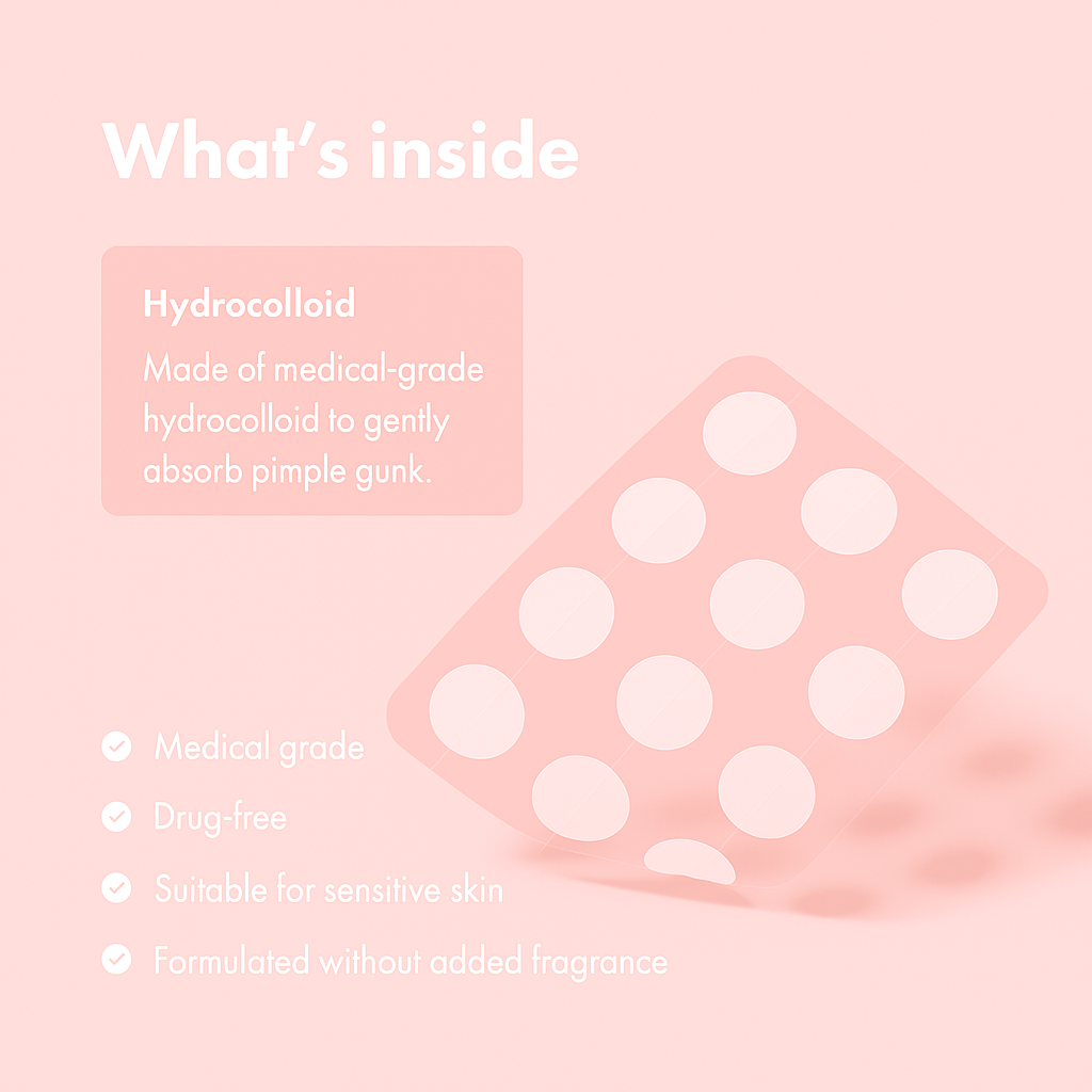 Hydrocolloid, a medical-grade gel that effectively absorbs impurities. Chemical-free, allergy-tested, ideal for sensitive skin.